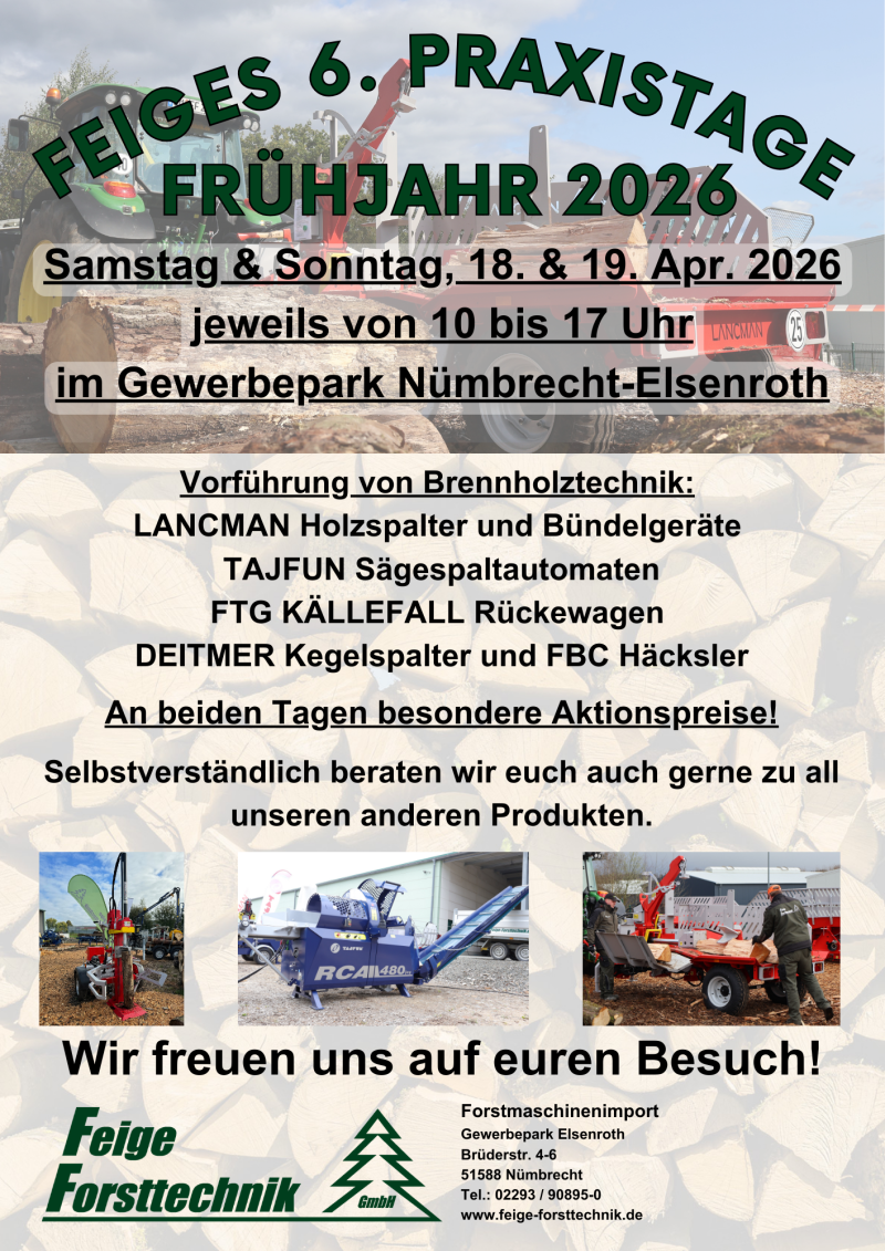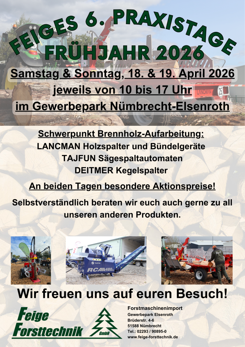 Die Feige Forsttechnik GmbH importiert qualitativ hochwertige, aber bezahlbare Forsttechnik aus aller Welt für Waldarbeiter, Waldbauern, Forstbetriebe, Forstbetriebsgemeinschaften, Brennholzwerber, professionelle Rücker, Behörden und Verbände. Nur 7 km entfernt von der Autobahn A4 (Köln-Olpe), im Gewerbepark Nümbrecht-Elsenroth, steht unsere 1.900 m² große Vertriebshalle.