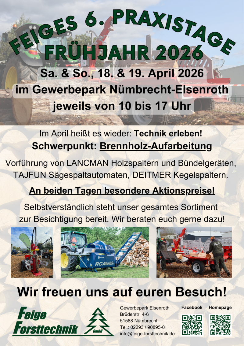 Die Feige Forsttechnik GmbH importiert qualitativ hochwertige, aber bezahlbare Forsttechnik aus aller Welt für Waldarbeiter, Waldbauern, Forstbetriebe, Forstbetriebsgemeinschaften, Brennholzwerber, professionelle Rücker, Behörden und Verbände. Nur 7 km entfernt von der Autobahn A4 (Köln-Olpe), im Gewerbepark Nümbrecht-Elsenroth, steht unsere 1.900 m² große Vertriebshalle.